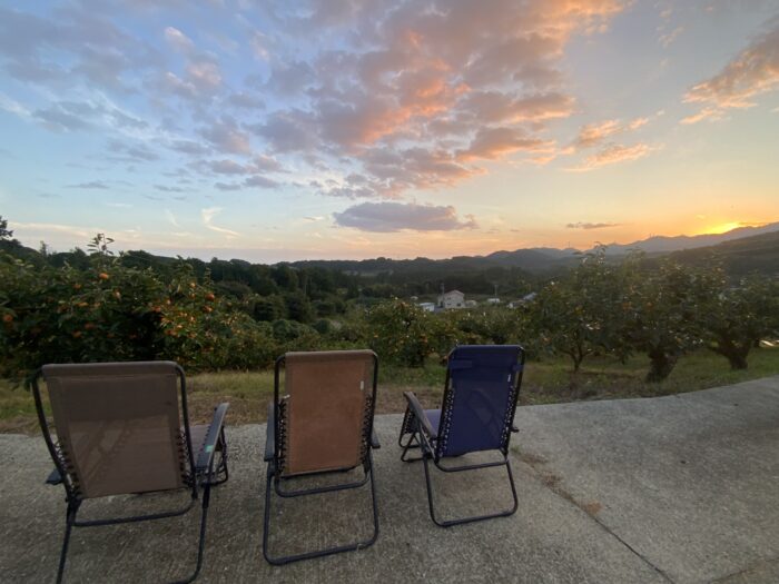 今日はその園地の準備を行いました。摘み取り園の一番上、見晴らしの良い場所にリクライニングシートを設置しました。