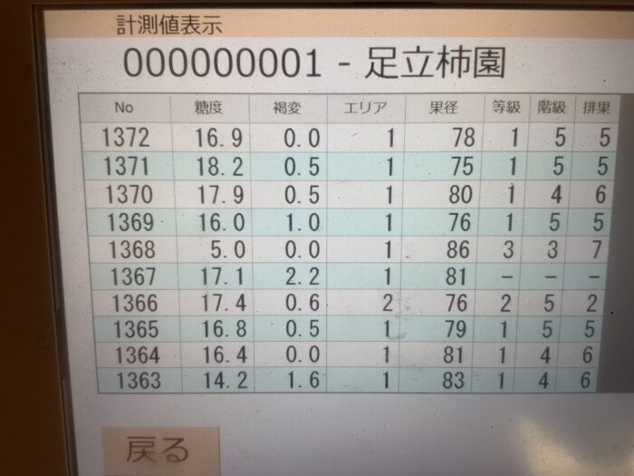 足立柿園では、光センサーを搭載した選果機を使用しており、柿のサイズや糖度、さらに内部の虫の有無まで判別できるようになっています。