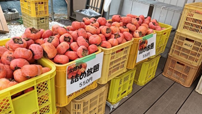 本日より、収穫が終わるまでの短い期間ではありますが、直売所で“次郎柿の詰め放題”を開催します。