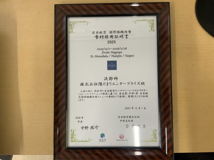 先日、足立柿園の次郎柿が日本航空の国際線の機内食に使用していただいたことを書きましたが、このたび浜松市さんから食材採用証明書を送っていただきました。